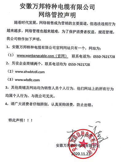 鄭重聲明:安徽萬邦特種電纜有限公司官方網站為:www_wanbangcable_com.longqias.cn,除此之外無任何子網站或合作網站,其余均為假冒偽劣。電話:0550-7621728 13485756353 地 址:安徽省天長市滁州高新技術產業開發區經四路29號